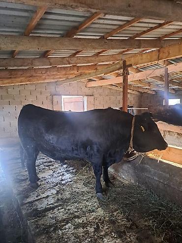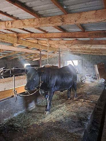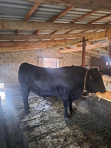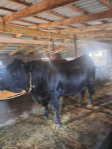 Племенной бык чёрного окраса (вероятно мясного направления, тип ангус/помесь). Крупный, мощный корпус, широкая грудь, развиты мышцы задней части. Спокойный темперамент, содержится на привязи в тёплом коровнике. Ушная бирка установлена.