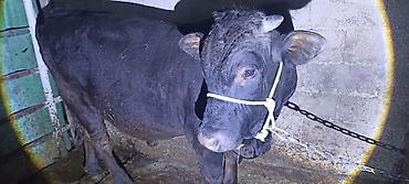 Бык мясного направления, черной масти, рогатый. Крепкий широкий корпус, хорошо выраженная мускулатура по спине, шее и бедрам. Прямой сильный хребет, глубокая грудь, ровные конечности. Спокойно стоит на привязи, аккуратно ведется на недоуздке. Содержится в стойле, на фото видно состояние откорма и упитанность.