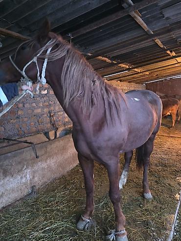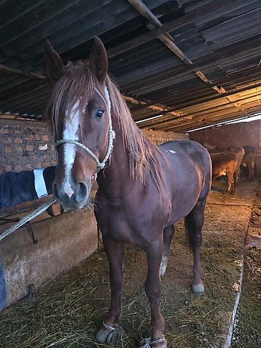 Гнедой жеребец с белой проточиной на морде и отметинами на корпусе. Крепкая, высокая посадка, развитая мускулатура, ровные конечности. Длинная густая грива и хвост. Спокойно стоит на привязи, охотно идет на поводу. Подходит для верховой езды и хозяйственных работ.