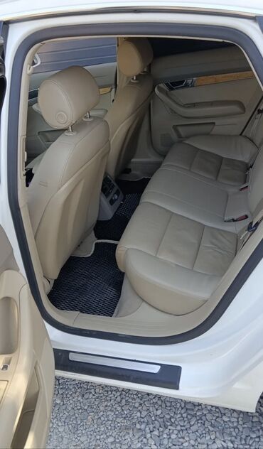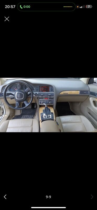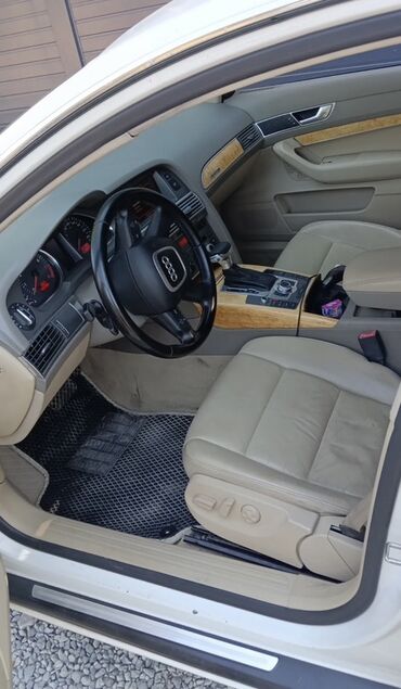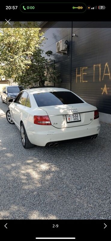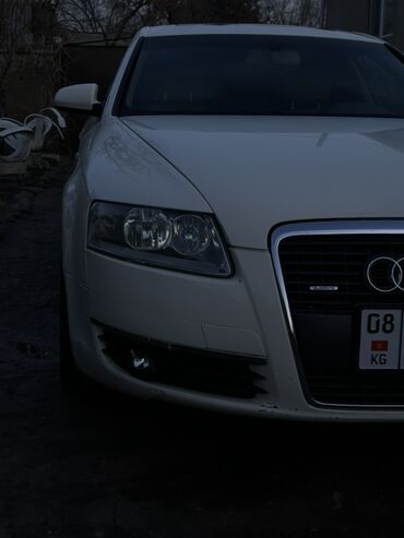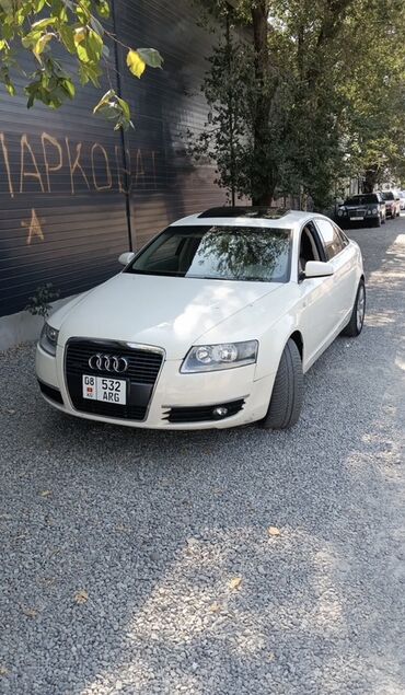 Audi A6 седан, белый цвет, двигатель 3.2 (надпись 3.2 на крышке багажника), двойные круглые патрубки выхлопа с каждой стороны. Интерьер светлый бежевый: кожаные сиденья с электрорегулировками, многоуровневые регулировки и поддержка, потолок и карты дверей в тон. Панель с декоративными вставками под светлое дерево, центральная консоль с селектором АКП и шайбой управления MMI. Мультируль с логотипом Audi, комбинация приборов с красной подсветкой, штатная мультимедиа с дисплеем, CD/радио, климат-контроль с раздельными зонами, подогревы, множество физических клавиш. Электропакет, качественные коврики, тонированные стекла. Литьё Audi, дисковые тормоза по кругу, противотуманные фары. Номерные знаки KG.