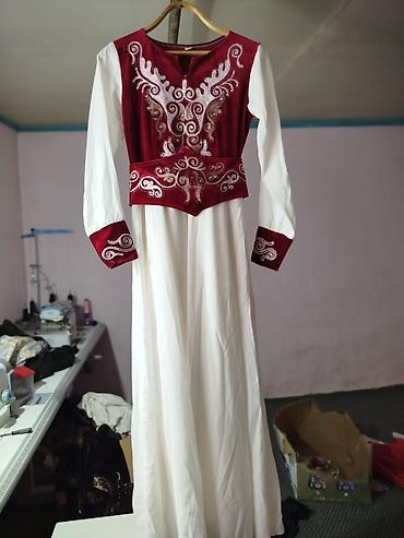 - Длинное белое платье с бордовым бархатным корсажем и манжетами. Богатая орнаментальная вышивка бисером и пайетками на лифе и пояса-пеплума, длинные рукава, свободный расклёшенный низ.