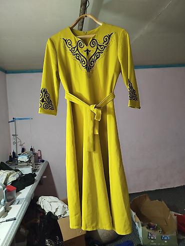 - Ярко‑жёлтое платье миди с поясом на талии. Рукава 3/4, V‑образная декоративная вставка с контрастной чёрной вышивкой на груди и на манжетах, вырез «капля» сзади.