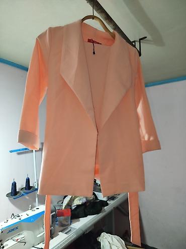 - Лёгкий персиковый кардиган/жакет без застёжки с мягкими лацканами и длинным поясом. Прямой крой, рукава 3/4, лаконичный минималистичный дизайн.