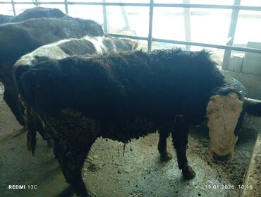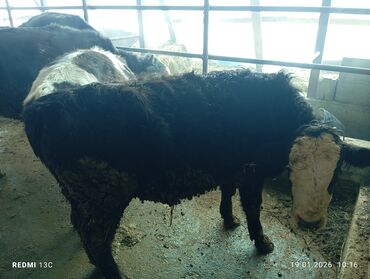 Бык чёрно-белой масти, содержится на привязи в помещении. Крупная, крепкая конституция, широкая грудь, хорошо развитый корпус. Прямая спина, сильные конечности, густая зимняя шерсть. На голове — светлая маска, тёмные уши; тело преимущественно чёрное с белыми участками на крестце и боках. Рога короткие, аккуратно подпилены/срезаны (визуально — безопасная оснастка на голове). Кормление сеном; на фото — стойловое содержание с поилкой и кормушкой.