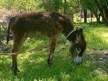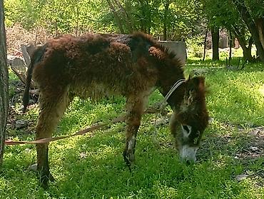 Осёл (долговязый тип, густая кудрявая шерсть рыже‑бурого цвета с тёмной спиной).