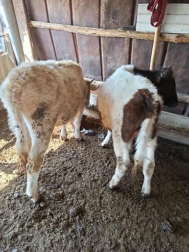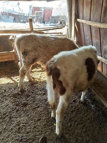 Телята, помесные молочно-мясные. На фото — двое молодняка с густой зимней шерстью, разноокрашенные (бело-рыжие/бело-бурые). Содержание в тёплом стойле, есть ушные бирки. Крепкие ноги, широкий крестец, хороший набор массы. Подойдут для откорма на мясо или дальнейшего разведения в личном хозяйстве. Едят с кормушки, приучены к стойловому содержанию.