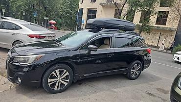 Subaru Outback, кроссовер с полноценным симметричным полным приводом и высоким клиренсом. Цвет: темно‑серый. На крыше установлен аэродинамический багажный бокс на штатных рейлингах. Основные особе...