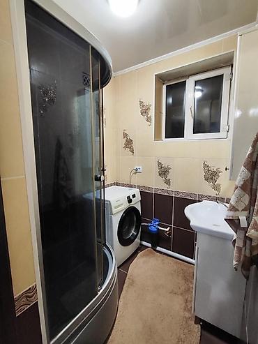 - Санузел: душевая кабина, раковина с тумбой, стиральная машина, кафельная отделка, окно для проветривания.