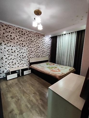 - Спальня: двуспальная кровать, прикроватные тумбы, комод, плотные шторы и точечная подсветка. Ламинат по всей квартире.