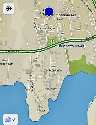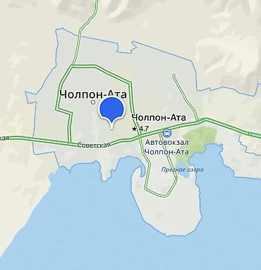- Расположение: центральная часть г. Чолпон-Ата, рядом с ул. Советская. Ориентиры на карте: рынок, автовокзал Чолпон-Ата, Президентский парк, район Яхт-клуба «КРУИЗ», Змеиный мыс.