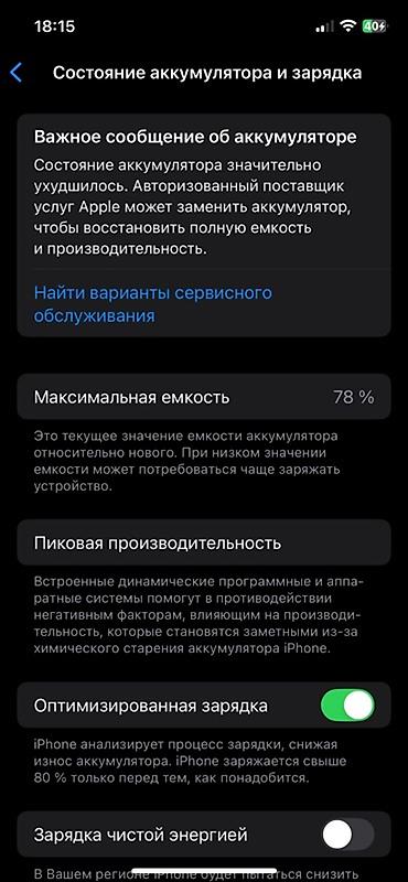 - На скриншоте “Состояние аккумулятора”: максимальная емкость 78%, показано предупреждение о необходимости замены для восстановления полной автономности.
