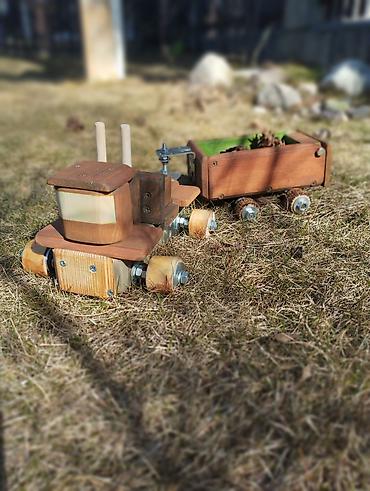 - Поверхность обработана и тонирована в тёплые древесные оттенки; внутренние стенки прицепа окрашены в зелёный цвет.