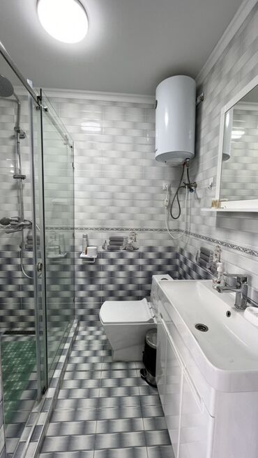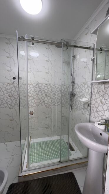 - Просторная душевая кабина со стеклянными дверцами, верхним и ручным душем.