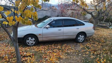 Mazda 626 седан, рестайлинг конца 90‑х. Основные характеристики: - Кузов: 4‑дверный седан, золотистый/бежевый цвет. - Привод: передний. - Колеса: легкосплавные диски, низкопрофильные шины. - Оптик...