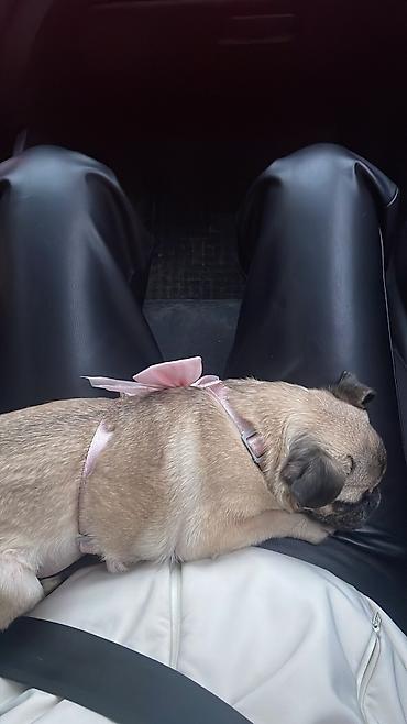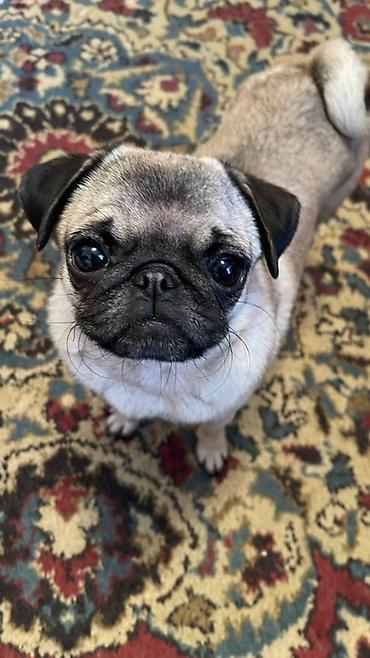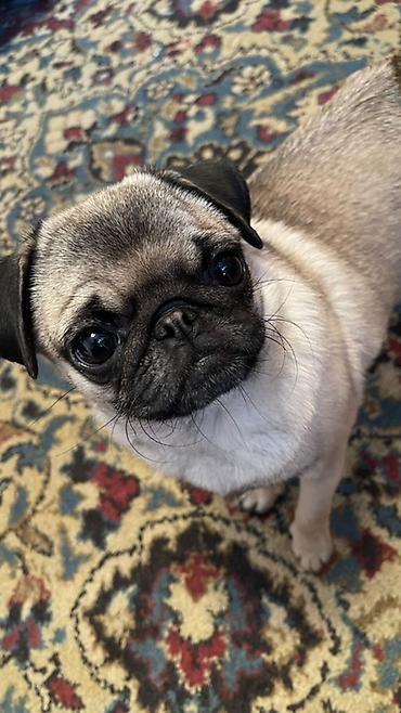 - Порода: мопс, стандартного окраса (палевый/бежевый с черной маской)