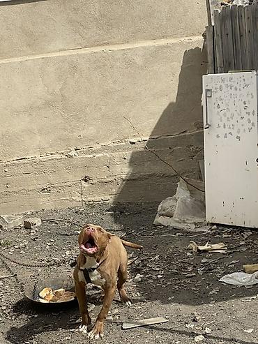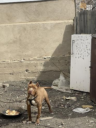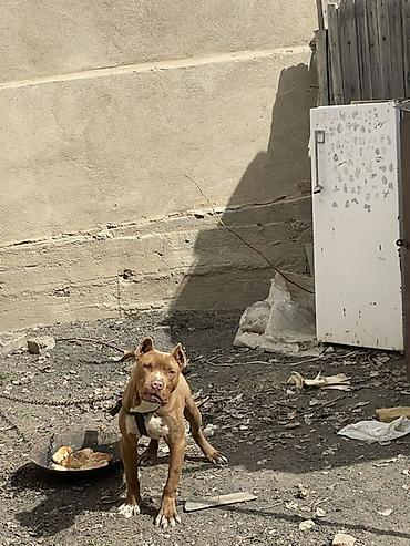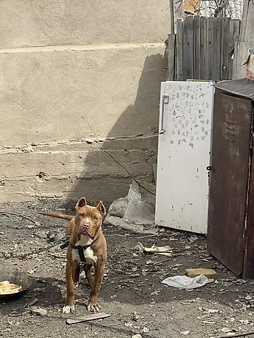Пёс (питбультип) рыжего окраса с белыми отметинами на груди и лапах. Уши купированы. Корпус мускулистый, крепкий костяк, широкая грудь, короткая блестящая шерсть. Хвост средний, прямой. На шее — шлейка; находится на цепи.