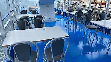 - На верхней палубе установлены прямоугольные столы и кресла; возможна свободная перестановка под формат мероприятия.