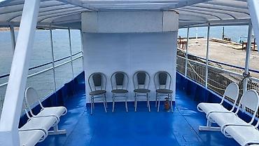 - Просторная верхняя палуба с перильным ограждением и навесом; расстановка столов и стульев для групповых поездок, банкетов и экскурсий.