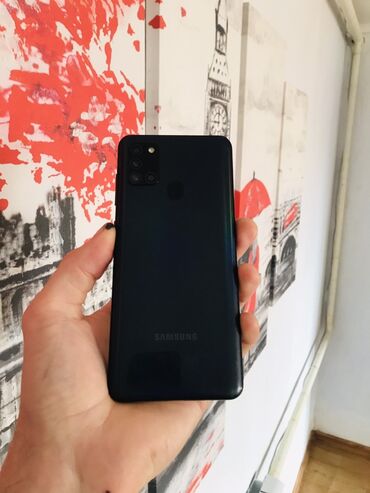 Смартфон Samsung A21s (линейка Galaxy A). Черный корпус, сканер отпечатка пальца на задней панели. Четыре основных камеры с LED‑вспышкой, фронтальная камера в вырезе экрана слева. Большой безрамочный дисплей с аккуратным отверстием под селфи‑камеру.