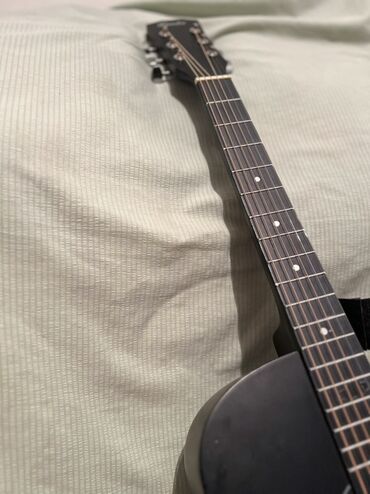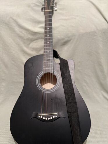 Акустическая гитара 6-струнная, форма корпуса дредноут с вырезом (cutaway). Цвет — черный глянец, окантовка розетки с белыми кругами. - Материал грифа: окрашенная древесина, накладка темная с точ...