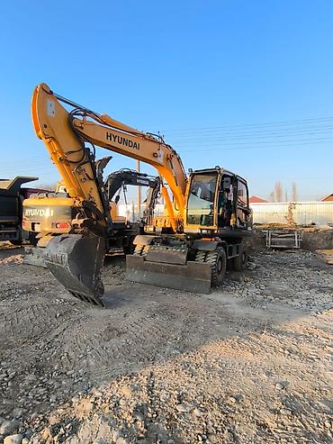 Колёсный экскаватор Hyundai (серия H) с фронтальным ковшом. Основные характеристики: - Колёсная база: 4x4, дорожные шины для работы на стройплощадках и в городе. - Гидравлическая стрела с мощными ...