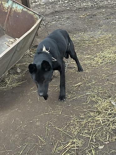 Собака, крупная, черная, короткошёрстная. Прямая спина, крепкие лапы, выразительные стоячие уши, длинный хвост. На фото — на ошейнике и цепи. Подойдёт в качестве дворового/сторожевого питомца: внимательная, настороженная к посторонним, хорошо ориентируется на участке.
