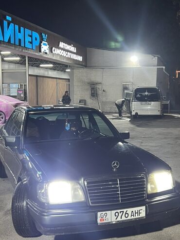 Классический бизнес-седан с легендарным дизайном W124. Прямоугольная оптика, хромированная решётка радиатора, эмблема на капоте. Кузов черный, тонировка стекол. Колёсные диски темного цвета, низкопрофильные шины. Передняя оптика исправна (на фото видна работа фар в ночное время).