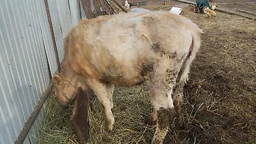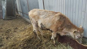 Бык молодого возраста, мясного направления. Окрас темно-каштановый с более светлой отметиной на лбу, крепкий костяк, широкая грудь и ровная линия спины. Содержится на привязи в стойле, кормится сен...