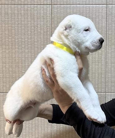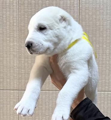 Щенки крупной породы (тип алабая/среднеазиатской овчарки), мощного костяка, с широкими лапами и плотной шерстью. В помёте щенки разного окраса: бело‑рыжие с маской и белые в крап (пятнистые). Голов...