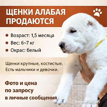 Алабаи — щенки на продажу - Возраст: 1,5 месяца - Вес: 6–7 кг - Окрас: белый Крупные, костистые щенки. В помёте есть мальчики и девочки. Фото и цена — по запросу в личные сообщения.