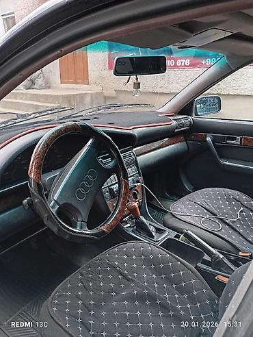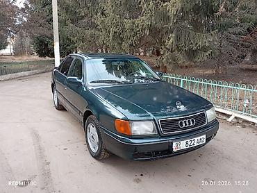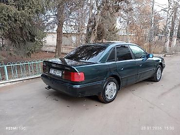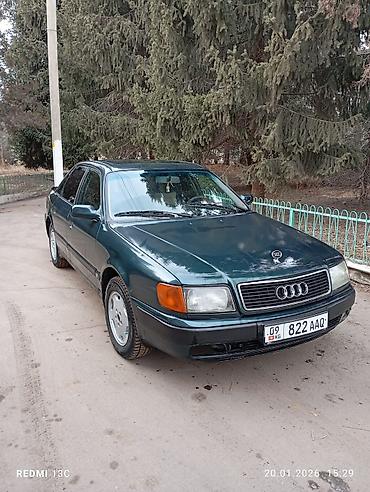 Audi 100 C4, седан, темно-зелёный цвет. Центральная решётка с четырьмя кольцами, оригинальные 15" диски. Передние галогенные фары, противотуманные фары в бампере. Тонированные стёкла, зеркала с электроприводом (кнопки на двери водителя).