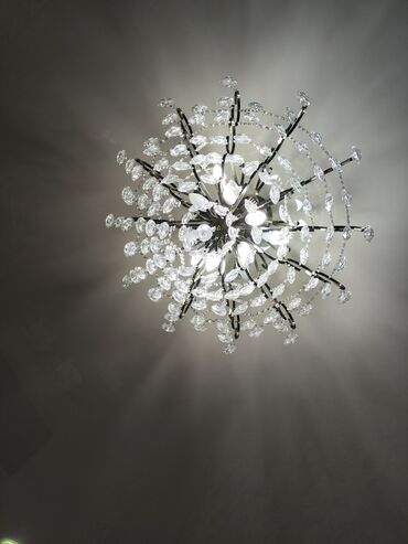 Эффектная и нарядная люстра: объемная форма «шар/букет», множество ограненных элементов, игра света и тени на потолке. Отличный выбор как центральное освещение комнаты.