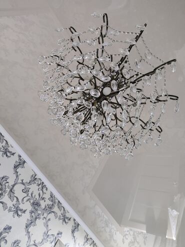 - Дизайн: многорожковая конструкция с изогнутыми металлическими лепестками; каскадные грозди прозрачных хрустальных подвесок «капля» и бусины