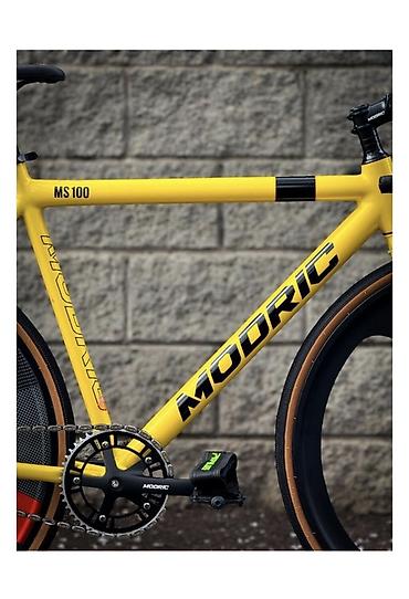 - Дополнительно: интегрированный зажим подседельного штыря, фирменные логотипы MODRIC по раме, яркая жёлтая окраска с чёрными элементами, буквация модели MS100 на верхней трубе.