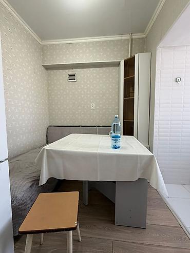 - Кухня со столом, угловым диванчиком, холодильником и навесным шкафом.