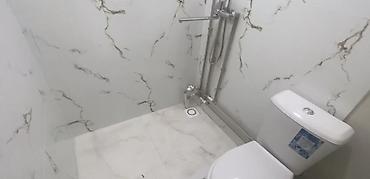 - Санузел совмещённый: душевая зона с трапом, смеситель-лейка, унитаз; стены и пол облицованы плитой/плиткой под мрамор, выполнена новая разводка труб.