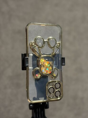- Прозрачные чехлы с объёмным медвежонком из золотистого контура. Внутри лап и животика – подвижные блёстки‑звёздочки с голографическим эффектом.