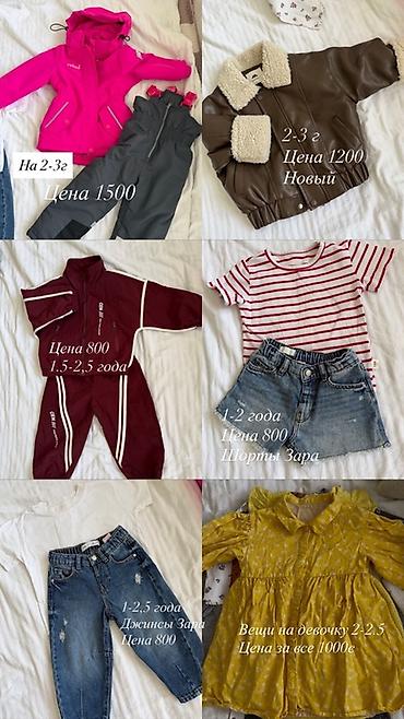 Детские вещи, на 3-4-5 лет , кофты по 200-250 сом, штаны 250-300 сом , белая вязаная кофта 300 сом. Куртка 700 сом. Комбенизон 850 сом. Аляски-обувь 800 сом.