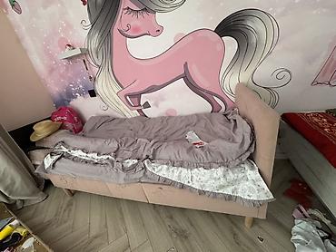 - Кровать №1 с мягким изголовьем и боковиной, на деревянных ножках, обивка розового цвета. Подходит под стандартный односпальный матрас. Компактная, с низкой посадкой — удобно для детей.