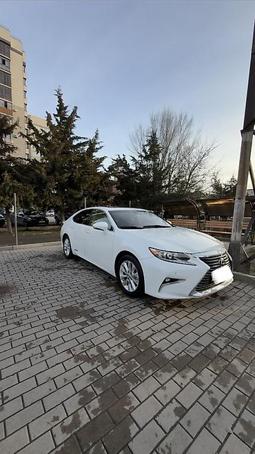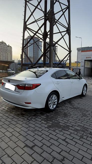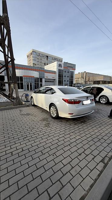 Lexus ES300h, белый седан бизнес‑класса с гибридной установкой. Элегантный дизайн с фирменной решеткой радиатора, светодиодной оптикой и 17" легкосплавными дисками. Маркировка Hybrid на порогах и крышке багажника.