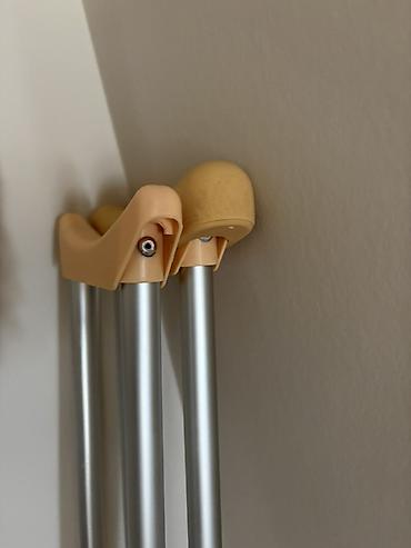 - Регулировка по высоте: телескопические стойки с фиксирующими отверстиями и металлическими кнопками; также регулируется высота подмышечной опоры и положение ручки.
