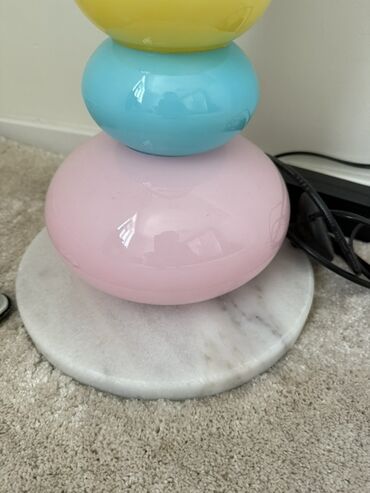 Торшер с цветными плафонами и устойчивым основанием из мрамора. Дизайн изделия включает чередующиеся плафоны овальной формы разных размеров и цветов, включая розовый, голубой, зеленый и желтый. Цвета плафонов создают яркое и игривое освещение, подходящее для комнаты или творческого пространства. Основание из белого мрамора придает торшеру устойчивость и элегантность, а также служит декоративным элементом. Лампа оснащена длинным черным кабелем, обеспечивающим удобное подключение к электросети. Стильный и функциональный элемент декора, который добавит света и цвета в любое помещение. Идеально подходит для создания уютной атмосферы в гостиной, спальне или рабочем кабинете.