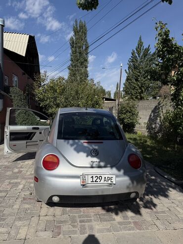 Автомобиль Volkswagen New Beetle серебристого цвета, отличающийся характерным округлым дизайном кузова. Модель имеет две двери и легкосплавные диски. Дизайн включает классические элементы «Жука», такие как выступающие крылья и круглые фары, что придает ему узнаваемый вид. Этот автомобиль идеально подходит для городской езды и для тех, кто ценит уникальный стиль.