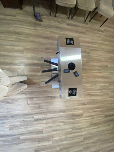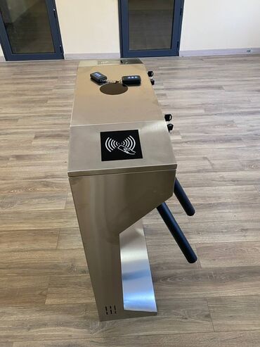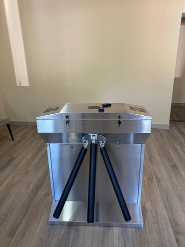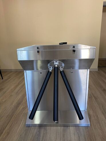 Турникет трипод из не ржавеющей стали . Имеет три вращающихся перекладины с черными наконечниками. Устройство предназначено для организации контролируемого доступа в помещения, например, в офисы, спортивные залы или другие учреждения.