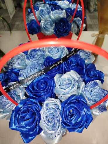 • Круглая композиция в красной коробке-корзинке с ручками — сочетание тёмно‑синих и светло‑голубых роз.