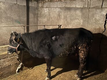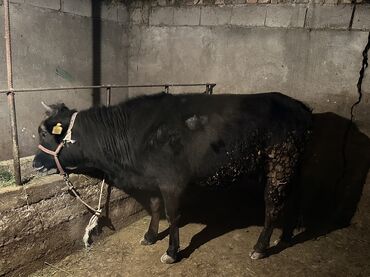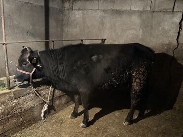 Продаётся чёрная корова (мясо‑молочного направления). Животное рогатое, с биркой‑идентификатором на ухе и недоуздком. Окрас однотонный чёрный, компактное телосложение, выраженная мускулатура корпуса. Содержится в стойле, приучена к привязному содержанию и спокойна при кормлении. На фото видно: