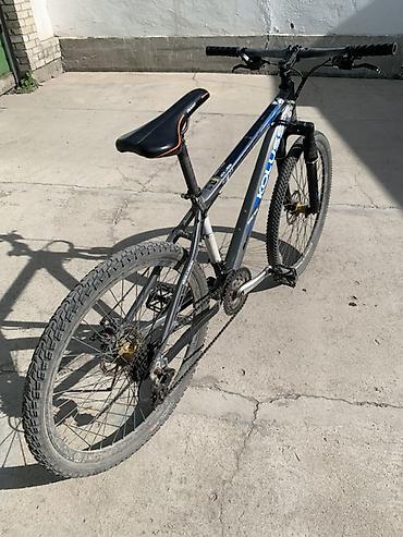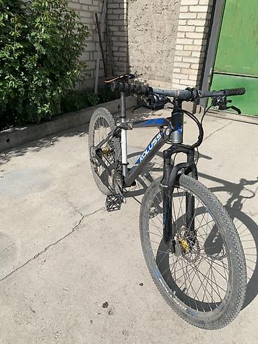 Горный велосипед Kolossi (надпись на раме), хардтейл. Основные особенности: - Колеса 26" с широкими внедорожными покрышками. - Амортизационная вилка спереди. - Рама из металла, спортивная геометри...