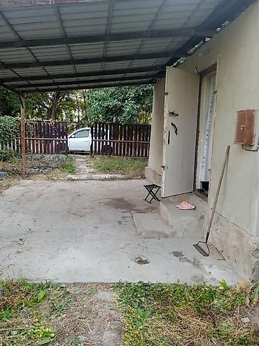 Небольшой дачный домик с крытым навесом и прилегающей площадкой из бетона.