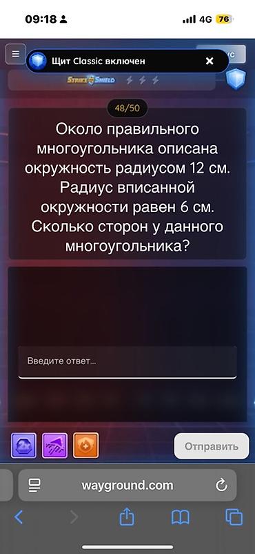 - Уровни с вопросами формата: «Около правильного многоугольника описана окружность радиусом 12 см. Радиус вписанной окружности равен 6 см. Сколько сторон у данного многоугольника?» и задачами на правильные многоугольники, углы, радиусы вписанных/описанных окружностей.