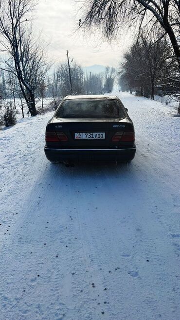 Mercedes-Benz E‑Class (W210), седан. Внешний стайлинг AMG: шильдики E3,2/AMG, оригинальные легкосплавные диски AMG. Кузов с фирменной хром‑окантовкой, тонированные стекла, противотуманные фары, омыватели фар. Номерные знаки KG (Кыргызстан), регион 08.